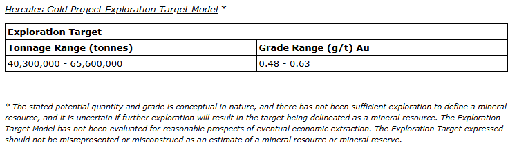 The Hercules gold project features an exploration target, as defined by NI 43-101, as follows.