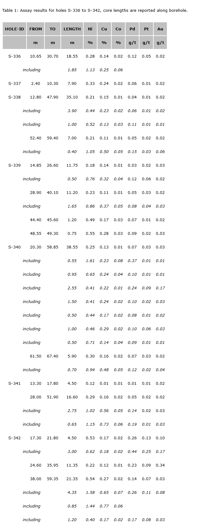 press release we reported partial assay results of holes S-332 to S-342, , today we are reporting assay results for 7 holes (S-336 to S-342) drilled on a newly discovered, near surface, nickel ("Ni"), copper ("Cu") and Platinoid Group Elements ("PGE") showing mineralization over an area of 500 metres ("m") by 400 m, open in all directions within a corridor of approximately three kilometres ("km") oriented north-west to south-east by 500 m to 700 m wide. There is a very good correlation between the strong conductivity seen in the 2013 and 2018 airborne electromagnetic surveys and the mineralized magmatic pyroxenite.