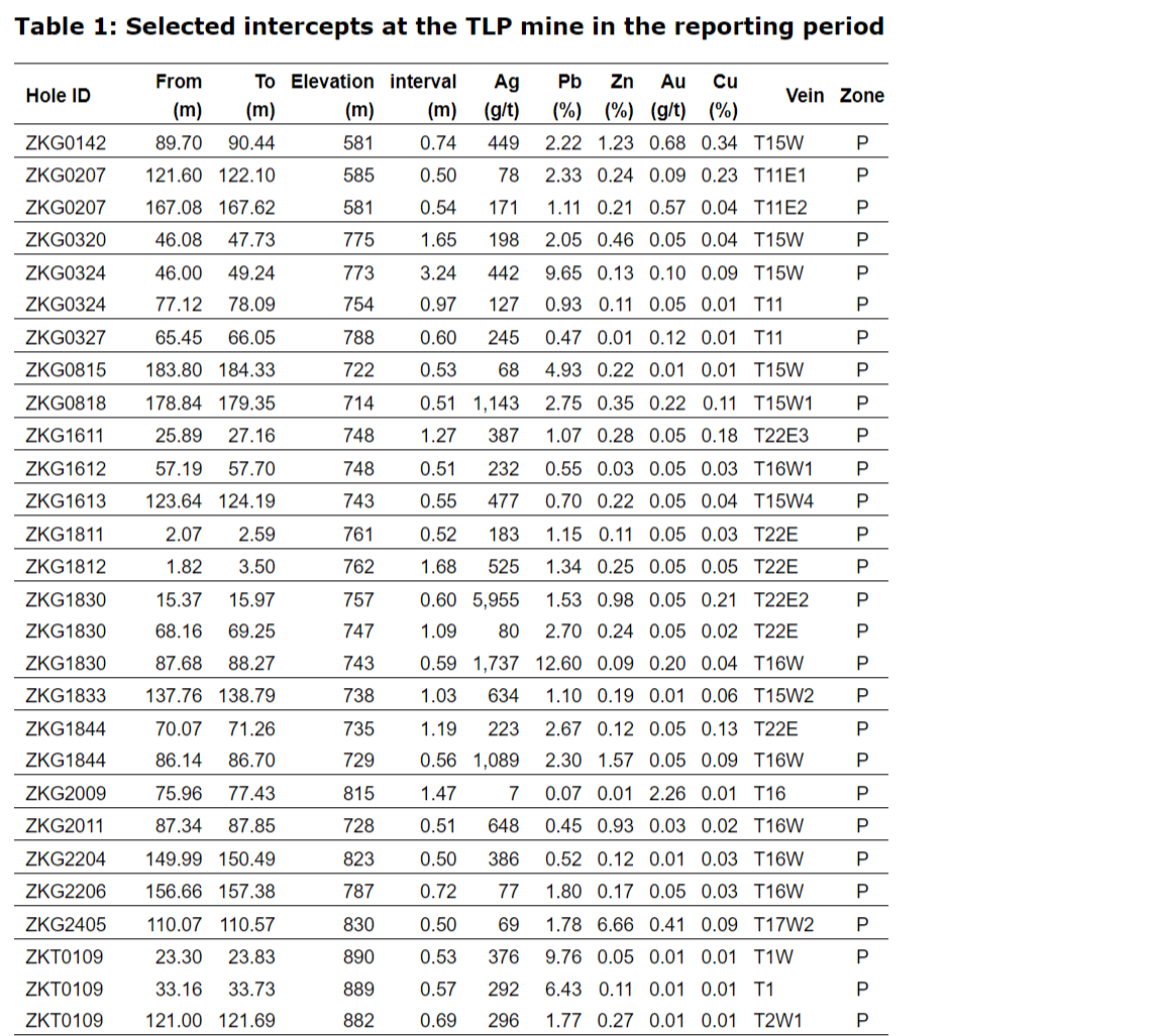 From June 16 to Dec. 31, 2023, a total of 23,742 m in 180 diamond drill holes, including 157 underground holes and 23 surface holes, were completed at the TLP mine. Assay results for 158 holes have been received, of which 101 holes intersected mineralized vein structures. Selected assay results are presented in an attached table.