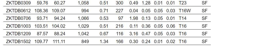 Surface hole ZKTDB0207 intersected 948 g/t Ag and 0.47 per cent Pb over a 0.55 m interval of vein T28E at the 1,104 m elevation; and 1,453 g/t Ag, 4.58 per cent Pb, 1.69 per cent Zn and 0.53 per cent Cu over a 0.66 m interval of vein T1 at the 1,097 m elevation.