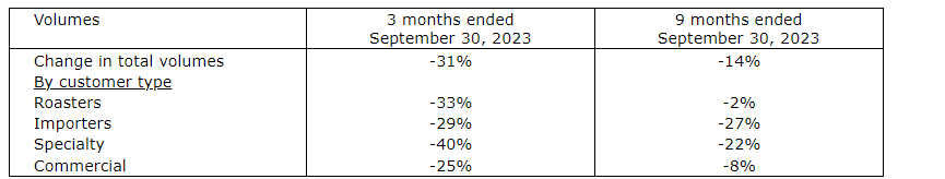 Adjusted EBITDA (earnings before interest, taxes, depreciation and amortization) was $1.5-million for the third quarter and $8.3-million for the year to date, representing a decrease of $2.8-million and $5.2-million, respectively, from the 2022 result. The decrease was driven mainly by lower sales volume and a reduced green coffee differential margin.