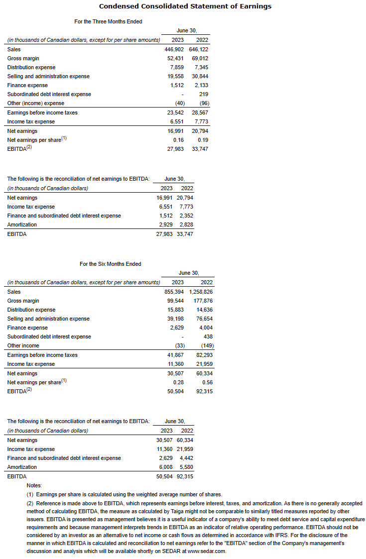 Taiga Building Products Ltd. has released its financial results for the three and six months ended June 30, 2023.