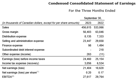 Net earnings for the nine-month period ended Sept. 30, 2023, were $51.9-million, compared with $78.9-million for the same period last year. The decrease in net earnings was primarily due to decreased gross margins during the period.