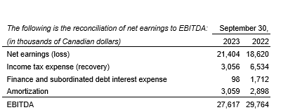 Net earnings for the quarter ended Sept. 30, 2023, increased to $21.4-million, compared with $18.6-million over the same period last year. The increase in net earnings was due to income tax recoveries from the prior year.