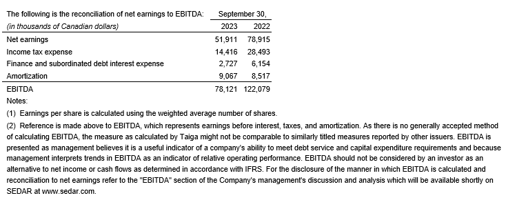Taiga Building Products Ltd. has released its financial results for the three and nine months ended Sept. 30, 2023.