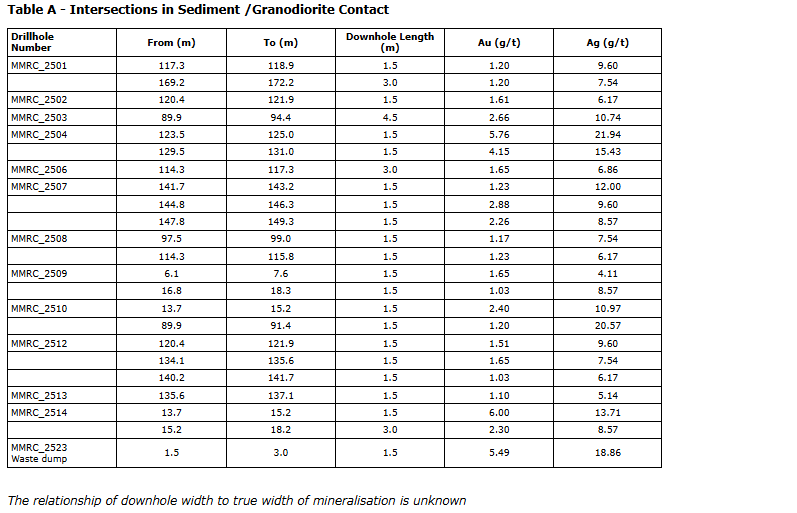 • Focused on sampling and assaying of the granodiorite/sediment contact with drill results up to 1.5 metres at 6.0 grams per tonne Au (gold) and 13.71 g/t Ag (silver) in hole MMRC_2514. The complete set of drill hole assays is shown in Table A.