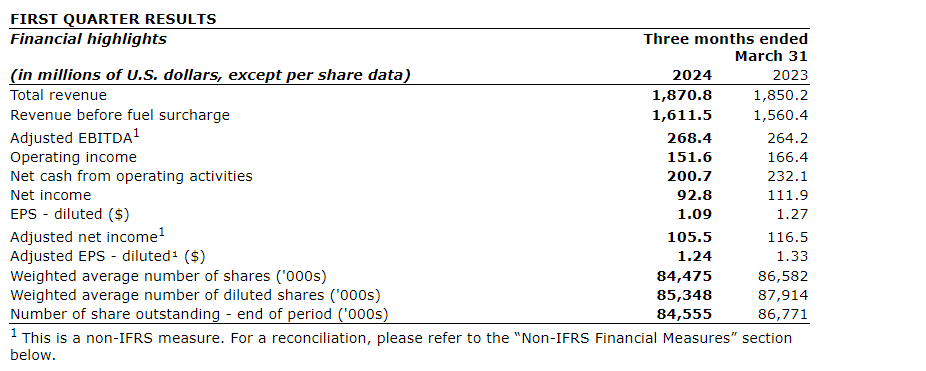 TFI INTERNATIONAL ANNOUNCES 2024 FIRST QUARTER RESULTS