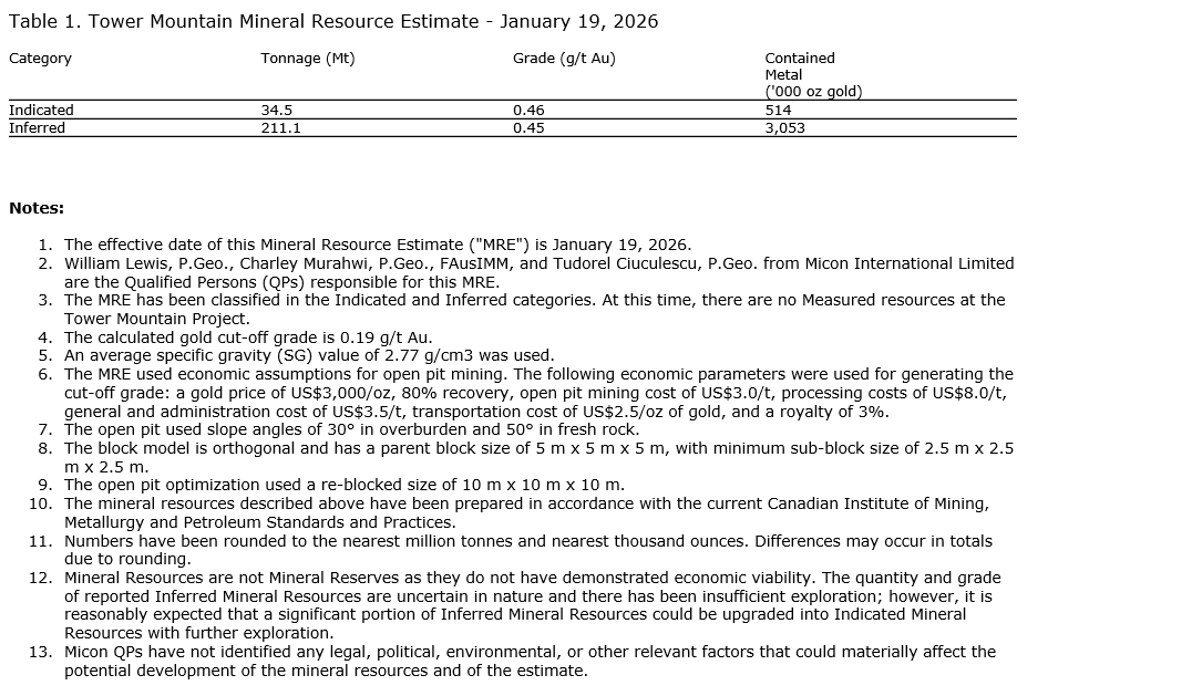 On Jan. 26, 2026, the company announced a mineral resource estimate for Tower Mountain as summarized in table 1. The estimate was prepared by Micon International Ltd., Toronto, Ont., Canada, an independent engineering firm specializing in mineral resource and reserve estimation for a global client pool.