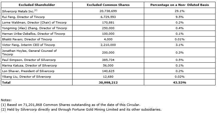 References to the exclusion of the votes attached to an aggregate of 30,814,651 common shares, representing approximately 43.28 per cent of the total issued and outstanding common shares as of the record date for the purposes of obtaining approval of the proposed transaction and the concurrent private placement from the minority shareholders in accordance with MI 61-101 and of the concurrent private placement from the disinterested shareholders in accordance with TSX-V Policy 5.3, as applicable, are replaced with the votes attached to an aggregate of 30,998,212 common shares, representing approximately 43.53 per cent of the total issued and outstanding common shares as of the record date to account for the votes attached to the 12,680 common shares held by Mr. Liu, a director of Silvercorp, which represent 0.02 per cent of the 71,201,868 common shares outstanding as of the date of the circular, and each of the tables in the circular setting out the name of each excluded shareholder, the number of excluded common shares held by such person and the percentage on a non-diluted basis of such person's shareholdings relative to the total number of common shares outstanding as of the date of the circular are replaced with the following table.