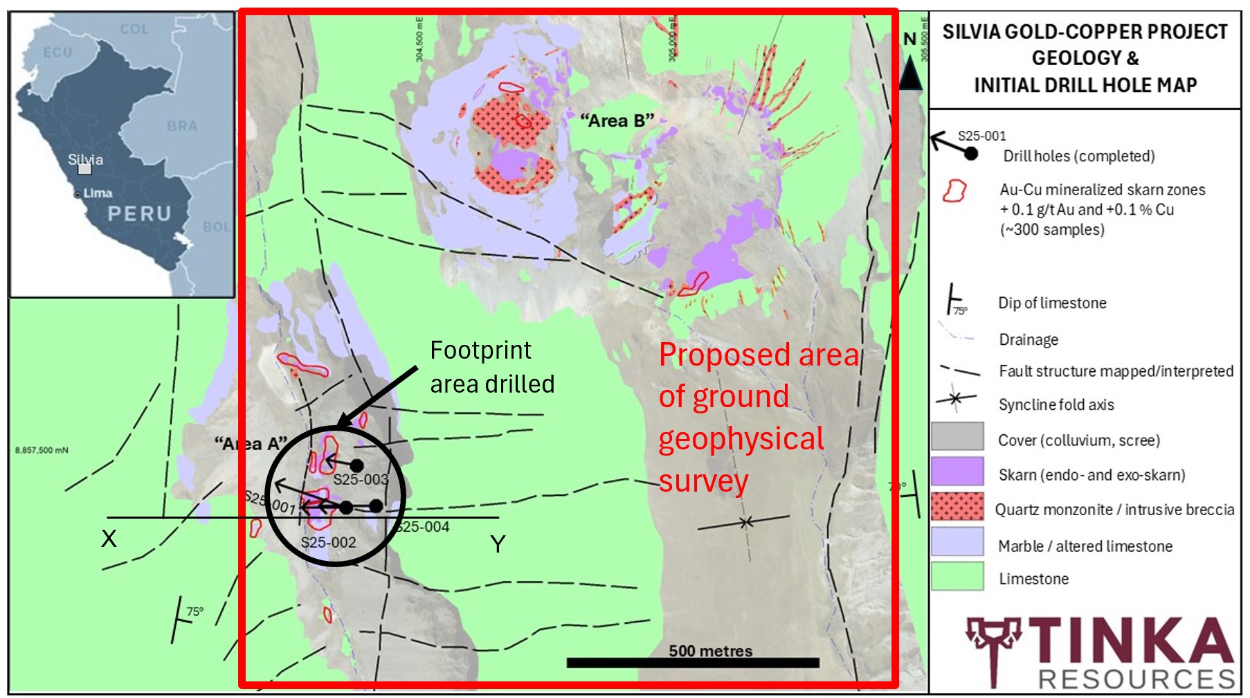 As foreshadowed in the initial Silvia drilling news release on January 23, 2026, the intervals of copper-gold mineralization in the drill holes are restricted to relatively narrow intervals at the contacts of intrusive monzonite dikes with the limestone. Skarn alteration (mostly green and brown garnets with later chlorite and quartz-carbonate) is strongly developed within a few metres of the contact zones. Sulphides (chalcopyrite, pyrite, and minor pyrrhotite) are typically restricted to narrow veins or minor disseminations within the skarn. It is encouraging that the copper and gold occur together. More exploration is required to target stronger concentrations, and it should be noted the footprint of the area tested was restricted in size (~ 0.05 km 2). Silvia NW has multiple exploration targets for skarn, and potentially porphyry style mineralization, covering a much wider area of approximately 3 km 2. Area B has the largest area of mapped skarn alteration which will be covered by an upcoming magnetotellurics (MT) survey, and possibly an Induced Polarization (IP) geophysical survey - Figure 2.