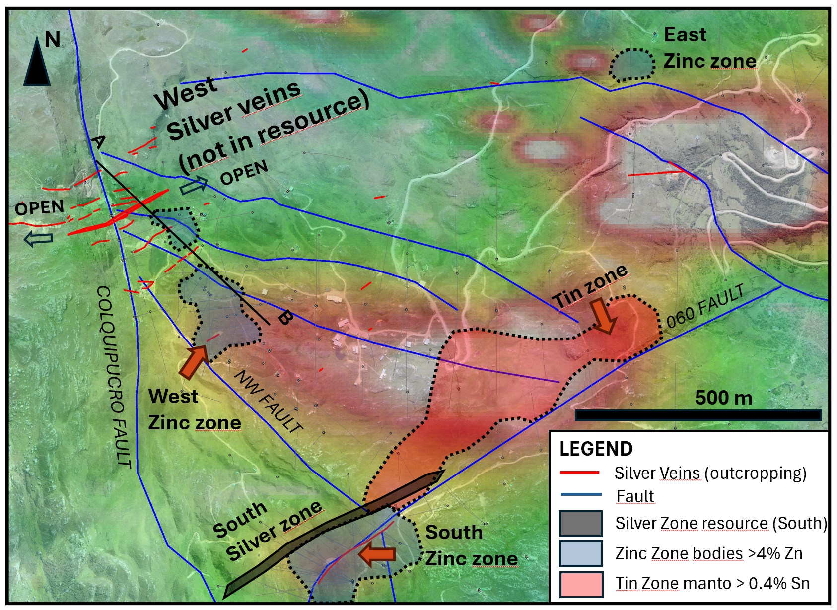 Other work being carried out by the Company's geological team is the development and implementation of a framework for the ranking of targets in preparation for the upcoming drilling program. In addition to plans for testing the expansion potential of the high-grade Zn-(Pb-Ag) zones at West and South Ayawilca, we are also re-evaluating our nearby Colquipucro silver mineral resource (included in 2024 Technical Report1, but unmodified since 2016) which lies just 2 km north of Ayawilca, as well as an area of silver-rich veins in outcrop (West silver veins - see Figure 3). Both Colquipucro and the West silver veins are potential silver targets for future drilling and will be considered for inclusion into any upcoming resource statements and economic studies.