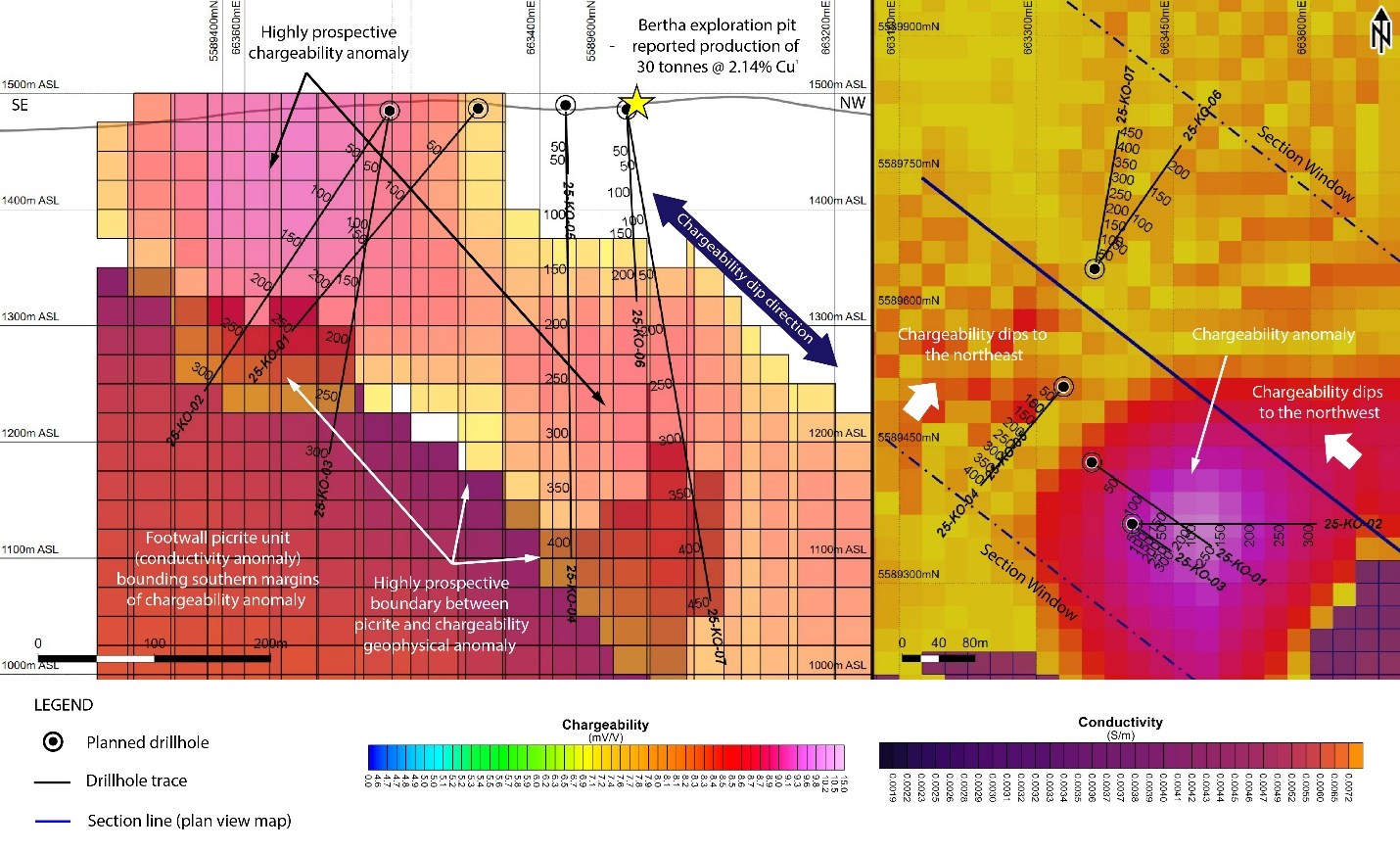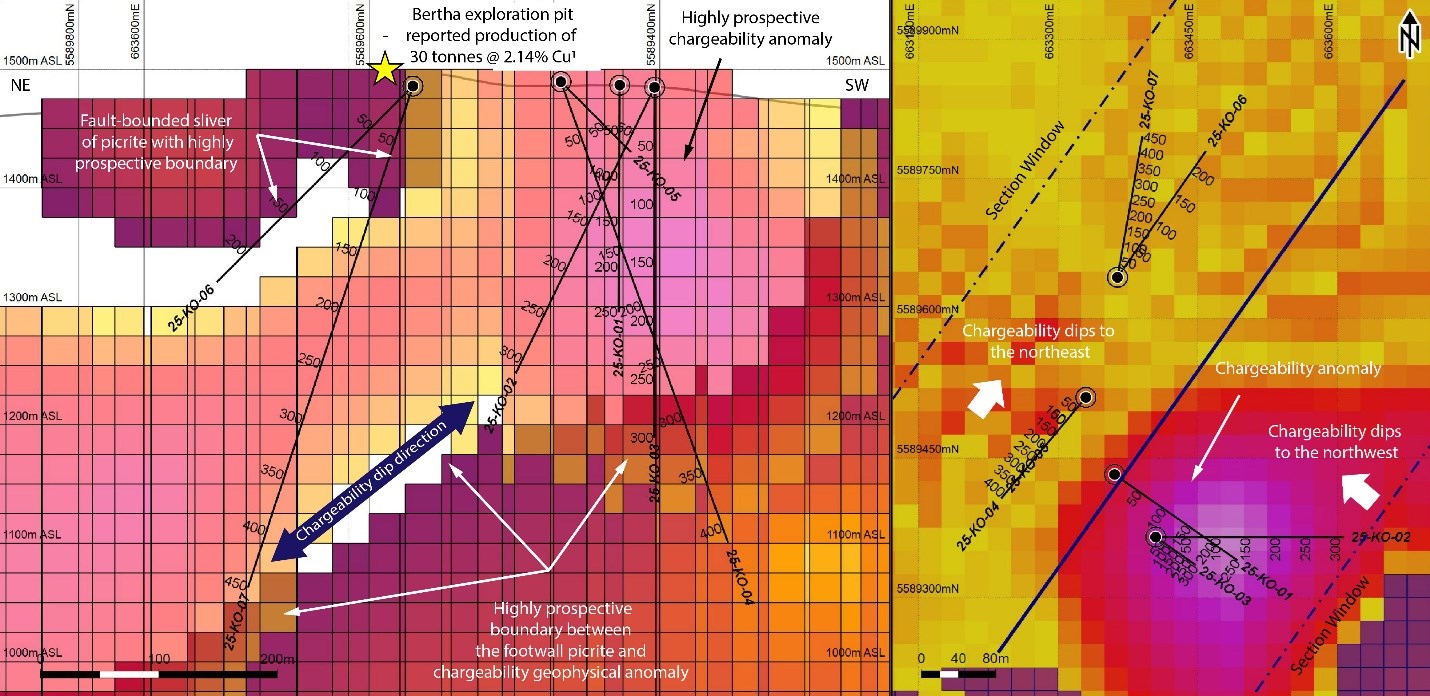 Chargeability Anomaly Indicates Scale Potential and Strong Structural Controls: The overall geometry of the chargeability anomaly appears controlled by the contact with the footwall picrite unit, identified by its strong conductivity (Figure 1, Figure 2). The orientation of this contact shifts from a northwest dip in the southeastern portion of the anomaly (tested by holes 25-KO-01 to 03) to a north to northeast dip within the western portion (tested by holes 25-KO-04 to 07).