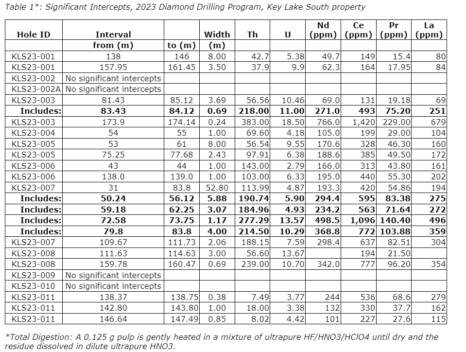 • The deepest intercept in hole KLS23-008, grading 239.00 ppm Th and 10.70 ppm U with anomalous Ce, La, Nd and Pr values, was taken from a quartz-rich zone within basement metasediments directly underlying the contact with overlying granitic orthogneiss.