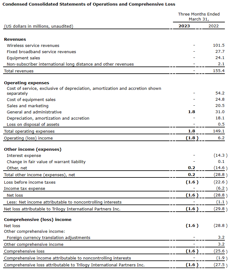 Trilogy International Partners Inc. has released its financial and operating results for the first quarter of 2023.