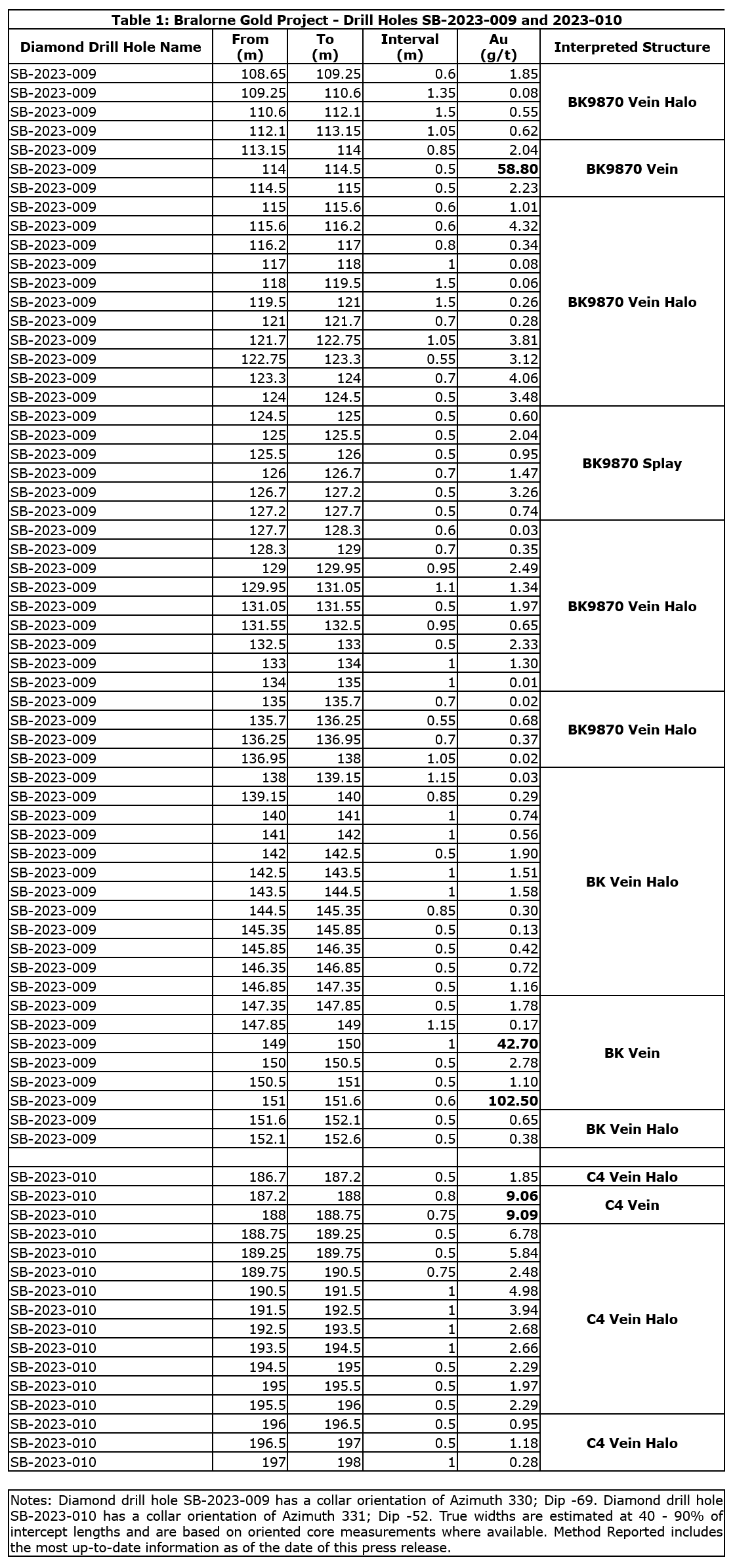 - Hole SB-2023-009 intersected 40.82 g/t Au over 2.60 metres within a broader interval of 8.54 g/t Au over 13.45 metres on the BK Vein.