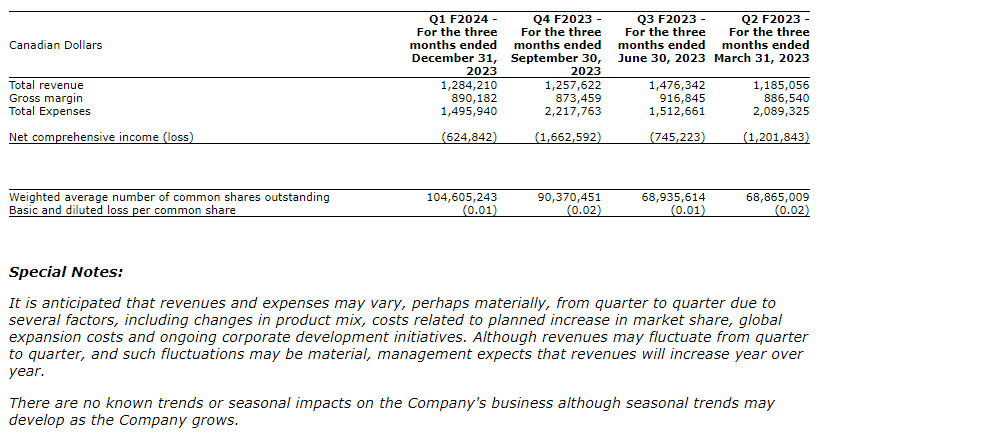 The consolidated financial statements and management discussion and analysis (MD&A) for the first fiscal quarter ended Dec. 31, 2023, are available on the company's SEDAR+ profile.