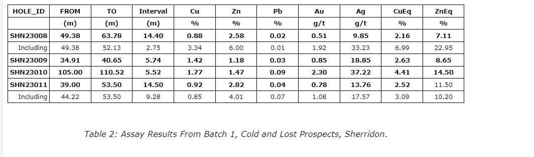 - 9.28 m grading 0.85 per cent Cu, 4.01 per cent Zn, 1.08 g/t Au and 17.6 g/t Ag (3.09 per cent CuEq) from 44.22 m.