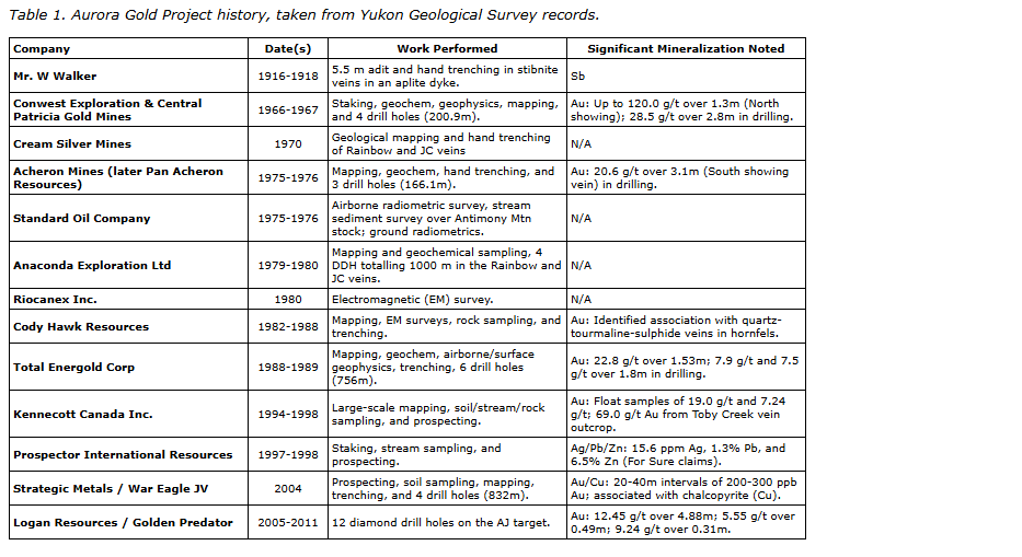 More recently, Logan Resources and Golden Predator conducted soil sampling surveys and limited diamond drilling (2005 to 2011), intersecting significant gold mineralization and defining further high-grade targets at the AJ vein and Golden Wall prospects (see Table 1).
