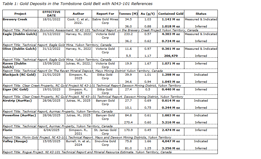 Gold mineralization in the Tombstone gold belt is typically associated with a distinctive multielement signature that includes bismuth, tellurium and tungsten, along with arsenic and antimony. Gold-bearing fluids exsolved from cooling intrusions and preferentially deposited gold in brittle, structurally controlled environments. Both high-grade, structurally controlled vein systems and lower-grade, bulk-tonnage deposits are known. The region hosts numerous significant deposits and is the site of recent discoveries by companies such as Snowline Gold Corp., Banyan Gold Corp., Sitka Gold Corp. and Prospector Metals.