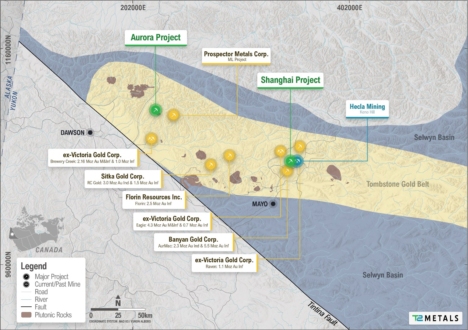 • Situated close to Dawson City and adjacent to the Dempster Highway (see Figure 1), the Aurora Project spans a significant land package within the Tombstone Gold Belt, one of North America's premier gold and silver mining districts.