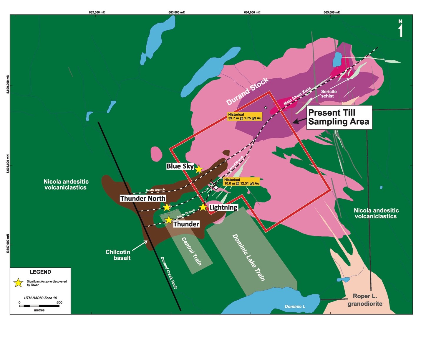 The eastern gold-grain anomalies are situated on the Durand Stock diorite which contains the eastern extension of the Blue Sky zone as demonstrated by Tower's recent high-grade gold intersection in Hole RN25-060 (6.02 m of 23.63 g/t Au; see July 10, 1995 press release) and possibly also by the intersection ~1.2 km further along strike to the northeast, in the middle of the stock, of 39.7 m vertically of 1.75 g/t Au in historical percussion hole No. 1990-05 (see Fig. 2). The gold grain anomalies are ~1 km down-ice from this fertile shear trend (see Fig. 3). Another potential gold grain source is the eastern extension of the Lightning shear trend as demonstrated by the intersection of 10.0 m 12.51 g/t Au in the stock in historical hole No. 1997-07, approximately 250 m northeast of the Lightning zone (see Fig. 2).