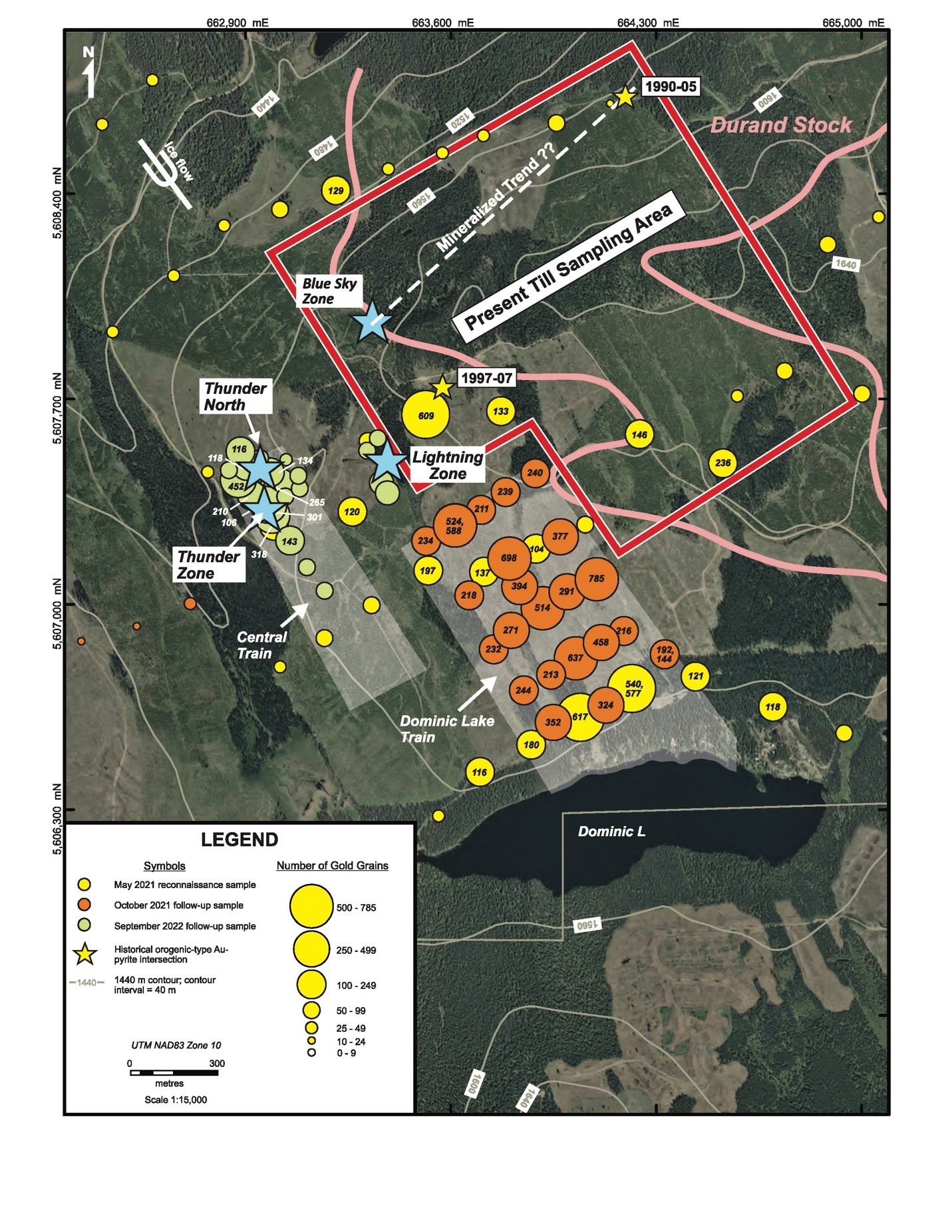 Whereas the Central Train was traced up-ice right to its source (the Thunder North zone), the Dominic Lake Train was traced only 800 m up-ice due to the arrival of winter conditions soon after the 2021 infill sampling was completed, leaving a significant gap between the train and the source(s) of its gold grains. The Lightning and Blue Sky gold zones, which are presently inferred to account for the western 150 m and eastern 250 m of the 400-m-wide train, respectively, were found subsequently by diamond drilling ~200 m and 600 m up-ice from the sampled part of the train (see Fig. 3). Blue Sky is also only 300 m up-ice from a strong, 609-grain gold anomaly that was identified in the initial reconnaissance till survey but not followed up because the anomaly is very close to the high-grade gold occurrence intersected in historical hole No. 97-07 (see Fig. 2) and was tentatively ascribed to this zone.