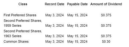 UNITED CORPORATIONS LIMITED ANNOUNCES DIVIDENDS