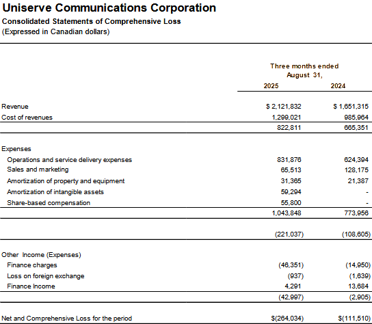 Vancouver, BC: October 24, 2025 – TheNewswire - Uniserve Communications Corporation (the “Company” or “Uniserve”)(TSXV: USS) a provider of IT solutions and services to business and residential customers in Canada wishes to announce first quarter fiscal 2026 financial results. Q1 fiscal 2026 revenues were $2,122K as compared to $1,651K for the same period in the prior fiscal year. Q1 fiscal 2026 Net Loss was $264K as compared to Net loss of $112K for the same prior year fiscal period. The Company will continue to focus on its operating results in fiscal 2026 by continuing to implement operational efficiencies, grow recurring revenues and enhance value added for its customers.