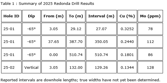 Together, these results demonstrate that copper-molybdenum mineralization at Redonda is laterally and vertically extensive in cross-section. A valid drill permit is currently in place, allowing for continued drilling at the project during the 2026 exploration season.