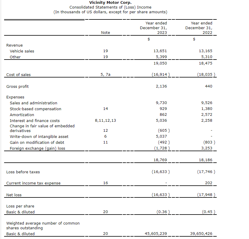 Vicinity Motor Corp. has released its financial and operational results for the fourth quarter and full year ended Dec. 31, 2023. All figures stated in this press release are in U.S. dollars unless stated otherwise.