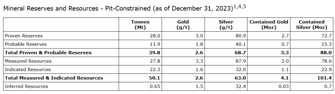 - Proven and probable mineral reserves for open-pit mining of 39.8 million tonnes containing 3.3 million ounces gold and 88 million ounces of silver;