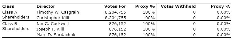 Management received the following proxies from holders of the corporation's Class A and Class B shareholders in regard to the election of the five directors nominated.