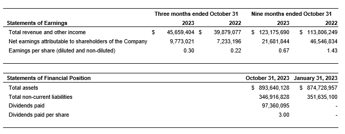 The unaudited financial information in this news release, including comparative information, is expressed in Canadian dollars and has been prepared in accordance with international financial reporting standards, using the same accounting policies and methods of application as described in notes 2 and 3 of the company's audited consolidated financial statements for the years ended Jan. 31, 2023, and Jn. 31, 2022.