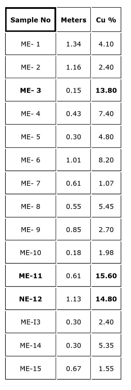 In 1970 Canadian Superior Exploration Limited collected Fifteen (15) continuous chip samples were taken across various sections of the mineralized veins, and their copper assay values, along with the sample widths, are given below: