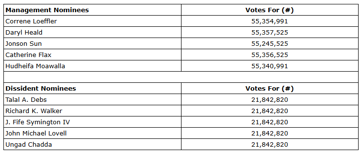 The meeting was contested, with an alternative slate of five dissident nominees being proposed at the meeting. Management's nominee directors, consisting of Correne Loeffler, Catherine Flax, Jonson Sun, Daryl Heald and Hudheifa Moawalla, received the highest number of votes "for" and were elected as directors of the company for the ensuing year.
