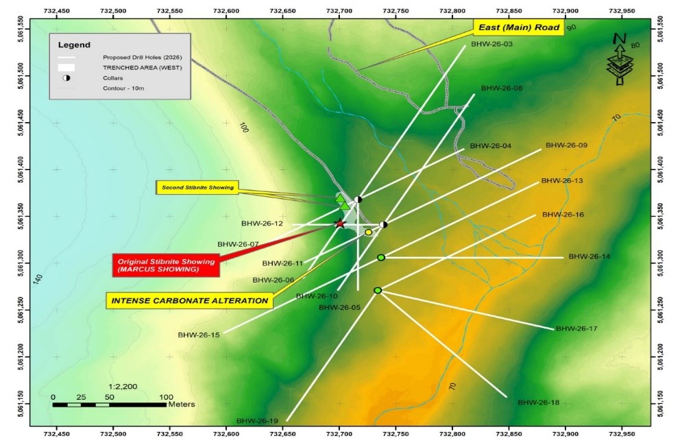 - Drilling on the Marcus (West) zone has begun and will be focused on intersected antimony-bearing stibnite at a depth of between 75 and 100 meters depth beneath the trenched area of the "Discovery Boulder" (see PR dated February 9, 2026)