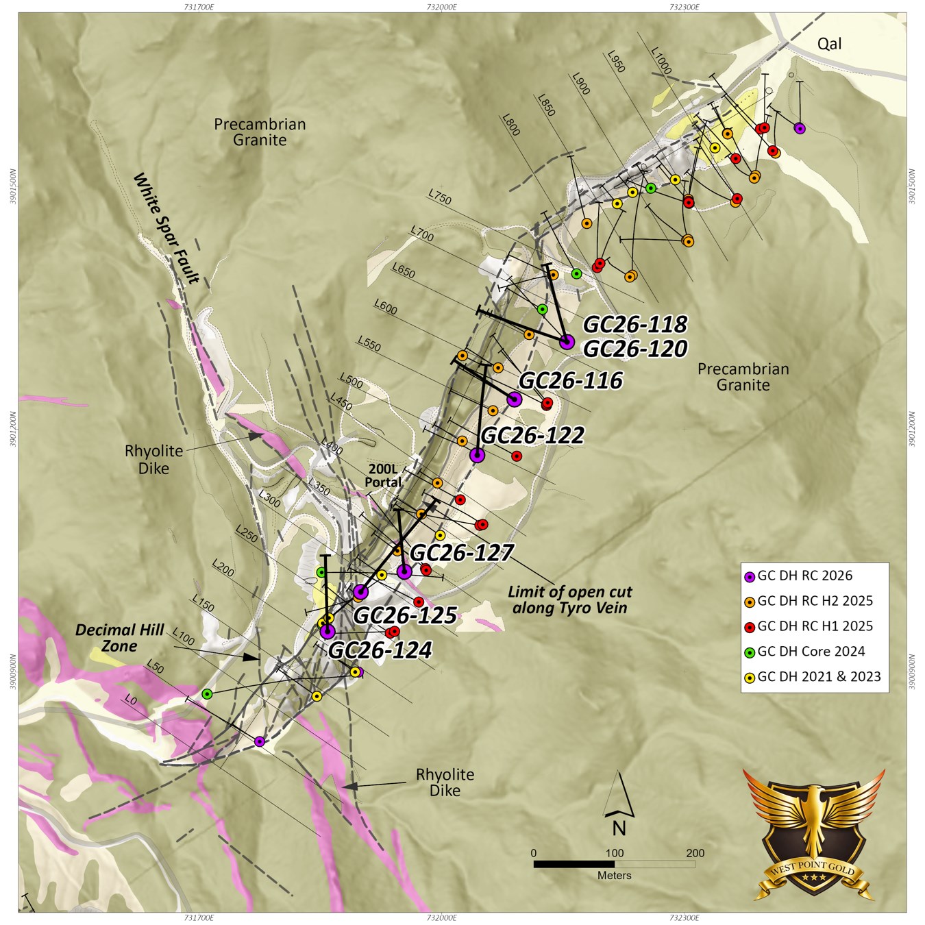 Figure 1: Plan view of the Main Tyro vein showing geology and drilling conducted in 2021, 2023, 2024, 2025, and 2026. Note the location of Hole Nos. GC26-116, GC26-118, GC26-120, GC26-122, GC26-124, GC26-125 and GC26-127.
