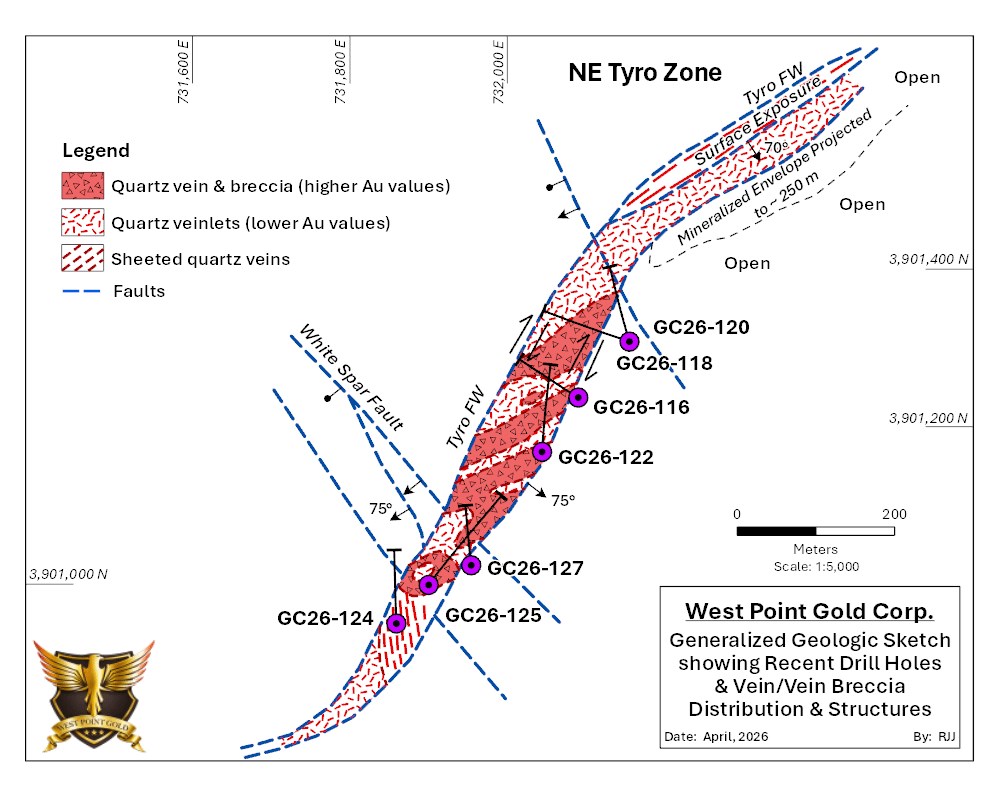 Vancouver, British Columbia--(Newsfile Corp. - April 23, 2026) - West Point Gold Corp. (TSXV: WPG) (OTCQB: WPGCF) (FSE: LRA0) ("West Point Gold" or the "Company") is pleased to announce drill results from the Tyro Main Zone at its flagship Gold Chain Project in Arizona. All the holes drilled intersected significant gold mineralization highlighted by 22.9 metres ("m") at 3.11 grams per tonne ("g/t") gold ("Au"). Results reported in the release are from seven reverse circulation ("RC") drill holes (1,419m), part of the recently expanded 20,000m drill program. These holes were drilled into the southern portion of the Tyro Main Zone and further confirm our interpretation of grades and structural controls within the zone. To date, 16,504m of the ongoing drill program at the Gold Chain project has been completed, with assays released for 1,419m of drilling. Results are pending from the Tyro Main Zone, NE Tyro, Bull 8 and Black Dyke targets, representing 24 holes (4,087m).