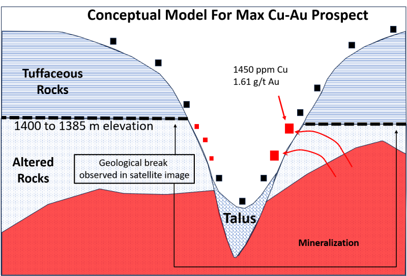 Figure 2. Geological concept model for Max Prospect shows overlying late tuffaceous rocks covering underlying altered rocks. The lower underlying altered rocks contain copper – gold mineralization, while the tuffaceous rocks are not mineralized and mask the mineralized areas. Soil samples collected above the tuffaceous rocks at approximately 1400 to 1385m elevation contain low gold and copper values (black squares).  Similarly, below the talus debris in the valley metal values are low. Soil samples collected within the altered rocks, below the tuffaceous rocks and above the talus development contain high gold and copper values proximal to possible copper – gold mineralization identifying a new exploration target for the area.