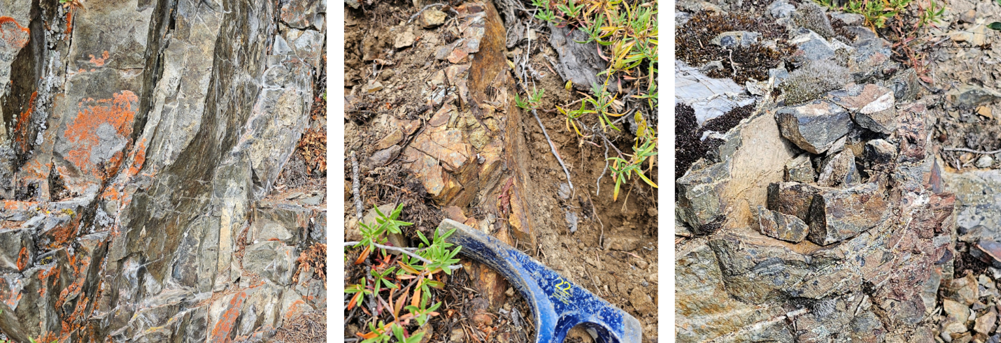 During the 2025 sampling program field observations noted pervasive brecciation, alteration and quartz veining in nearby outcrop. This supports the presence of a mineralizing system at and below this elevation level. See photos below.