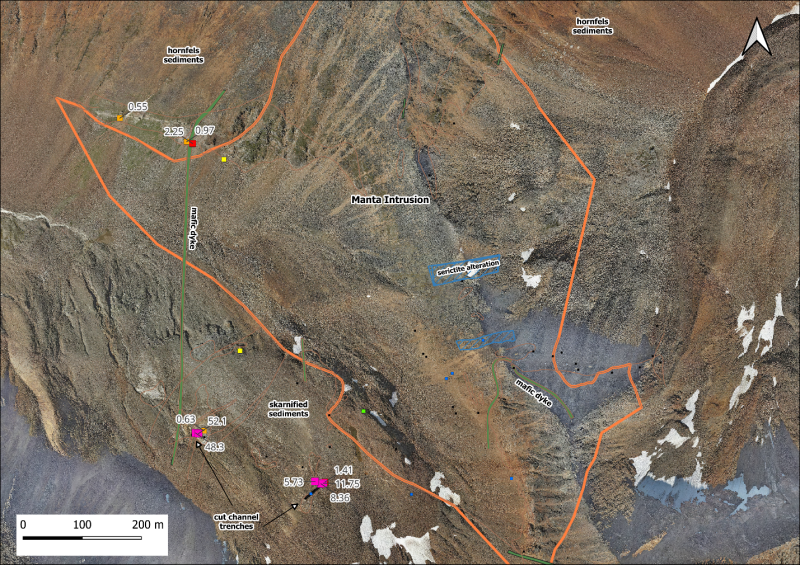 Trenching at the Manta showing yielded low-grade results despite high-grade grab samples. The Manta showing is located in altered sedimentary rocks at the contact with the Manta intrusive body, 1.5km south of the BiTe showing. Initial grab and 1m chip samples from quartz-bismuthinite veins in metasomatically altered skarn zone at two locations returned a 5 multi-gram gold results (5.73, 8.36, 11.75, 48.3 and 52.1 g/t gold, Figure 2). However, channel sampled trenches cut across each of these areas returned disappointing results with the best being 0.63 g/t gold over 1 m in the northern trench and 1.41 g/t gold over 1 m in the southern trench.