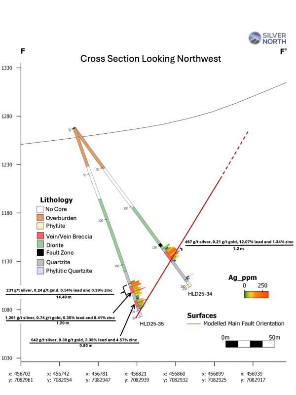 Hole HLD25-35 drilled on the same section and approximately 50 m downdip from HLD25-34 also intersected the Main Fault from 170.60 m - 198.50 m where the entire structural zone returned 27.90 m averaging 153 g/t silver, 0.18 g/t gold, 0.47 % lead and 0.75 % zinc. In HLD25-35, the Main Fault splits into two splays defined by an upper moderately oxidized siderite vein and vein breccia zone that is 14.40 m wide from 170.60 m to 185.00 m that returned 231 g/t silver, 0.24 g/t gold, 0.54 % lead and 0.39 % zinc including two high grade silver bearing zones including 1.25 m from 179.50 m to 180.75 m that averages 1,261 g/t silver, 0.74 g/t gold, 0.35 % lead and 0.41 % zinc. The low concentration of lead in this intersection suggests the presence of significant silver bearing sulphosalts that were not observable in the partially oxidized material. The lower splay consists of unoxidized galena and sphalerite bearing siderite vein breccia material that is 6.35 m wide from 189.80 m to 196.15 m and returned 55 g/t silver, 0.08 g/t gold, 0.27 % lead and 0.80 % zinc. A higher grade silver bearing section 0.80 m wide from 191.40 m to 192.20 m averages 642 g/t silver, 0.30 g/t gold, 3.38 % lead and 4.57 % zinc. The two splays of the Main fault are separated by 4.80 m of weakly mineralized quartzite and graphitic phyllite fault gouge material.