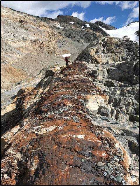 The Kitsap showing along the northwest trending ridge, early prospectors/miners, have pitted and drifted on the Kitsap showing. Limestone hosting galena-sphalerite mineralization is encountered. Sericite alteration zone of phyllite is approximately 4 m to the west of contact with limestone, and nearly 30 m wide on the eastern contact with limestone2 .