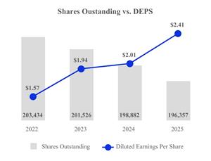 | Net income has shown consistent growth over the past four years. In 2022, net income was $305.3 million, increasing by 29% to $392.9 million in 2023. Growth continued in 2024 with net income reaching $402.2 million, a 2% increase from the prior year. In 2025, net income rose significantly to $475.4 million, representing an 18% year-over-year increase and marking the highest level in the period. | | Diluted earnings per share (DEPS) demonstrated strong growth over the past four years, rising from $1.57 in 2022 to $2.41 in 2025, an increase of 53%. Year-over-year, DEPS grew 24% in 2023, 4% in 2024, and accelerated to 20% in 2025, reflecting improved profitability. Shares outstanding declined steadily during the same period, moving from 203.4 million in 2022 to 196.4 million in 2025, a reduction of approximately 3.5%, which contributed to the increase in per-share earnings. This combination of higher earnings and reduced share count underscores the Company’s commitment to enhancing shareholder value. |