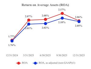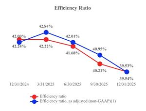 | ROA demonstrated strong improvement in 2025, rising from 1.77% in Q4 2024 to a peak of 2.17% in Q3 2025. ROA, as adjusted, (non-GAAP)(1) followed a similar trend, reaching 2.10% in Q3 2025. Despite a slight moderation in Q4 2025 resulting from the provision for credit losses, both measures ended the year above 2.0%, reflecting continued strength in asset utilization and profitability. These results underscore our ability to deliver superior returns and position the Company for sustained growth. | | The chart below underscores the Company’s strong and consistent performance in managing operating expenses, as reflected in its efficiency ratio over the past five quarters. The efficiency ratio is a key metric that measures how effectively the Company converts its revenue into net income by comparing non-interest expenses to total revenue. A lower efficiency ratio indicates greater operational efficiency and cost discipline, which are essential for sustaining profitability and enhancing shareholder value. |