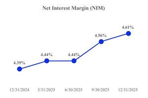 Our net interest margin was 4.61% and 4.56% for the three-month periods ended December 31, 2025 and September 30, 2025, respectively. The yield on loans was 7.30% and 7.39% for the three months ended December 31, 2025 and September 30, 2025, respectively, as average loans increased from $15.22 billion to $15.51 billion. The rate on interest bearing deposits decreased to 2.47% as of December 31, 2025, from 2.62% as of September 30, 2025, while average interest-bearing deposits increased from $13.32 billion to $13.47 billion.