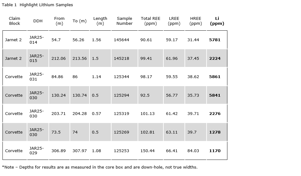 - JAR25-015 intersected 1.5 m grading 2,224 ppm (approximately 0.22 per cent) lithium at a depth of 212.06 m.
