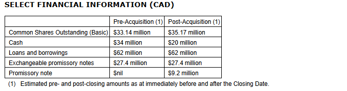 The acquisition shares were issued at a deemed price of $5.29 per acquisition share for a value of approximately $5.0-million (U.S.). The acquisition shares are subject to a four-month statutory hold period under applicable Canadian securities laws, in addition to such other restrictions as may apply under applicable securities laws of jurisdictions outside of Canada. Additionally, the acquisition shares are subject to contractual resale restrictions, with 30 per cent of the acquisition shares released on the dates that are 12 and 24 months following the closing date, and 40 per cent on the date that 36 months following the closing date.