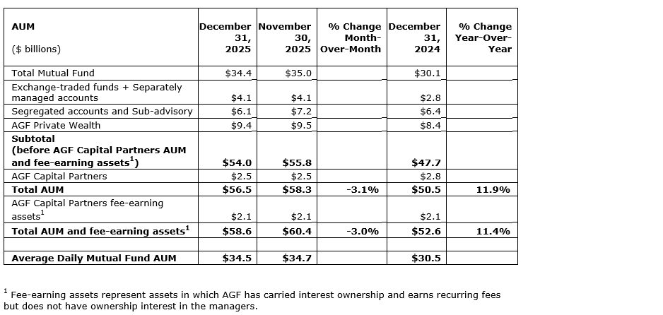 AGF REPORTS DECEMBER 2025 ASSETS UNDER MANAGEMENT AND FEE-EARNING ASSETS