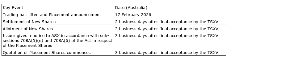 An indicative timetable for the placement is set out in the attached table. This timetable may be subject to change at the company's discretion, in compliance with applicable laws and the listing rules of the ASX and policies of the TSX-V.